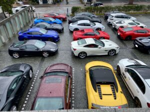 錚々たるスーパーカーがレストランの駐車場に並ぶ圧巻の光景です。南国風の景色ともマッチしていてます。大黒PAは混雑していて参加メンバーのクルマを並べることができなかったので、この場所で並んだ状態で撮影できて良かったです。総数としては40台以上のスーパーカー、スポーツカーがこの駐車場に集まりました。
